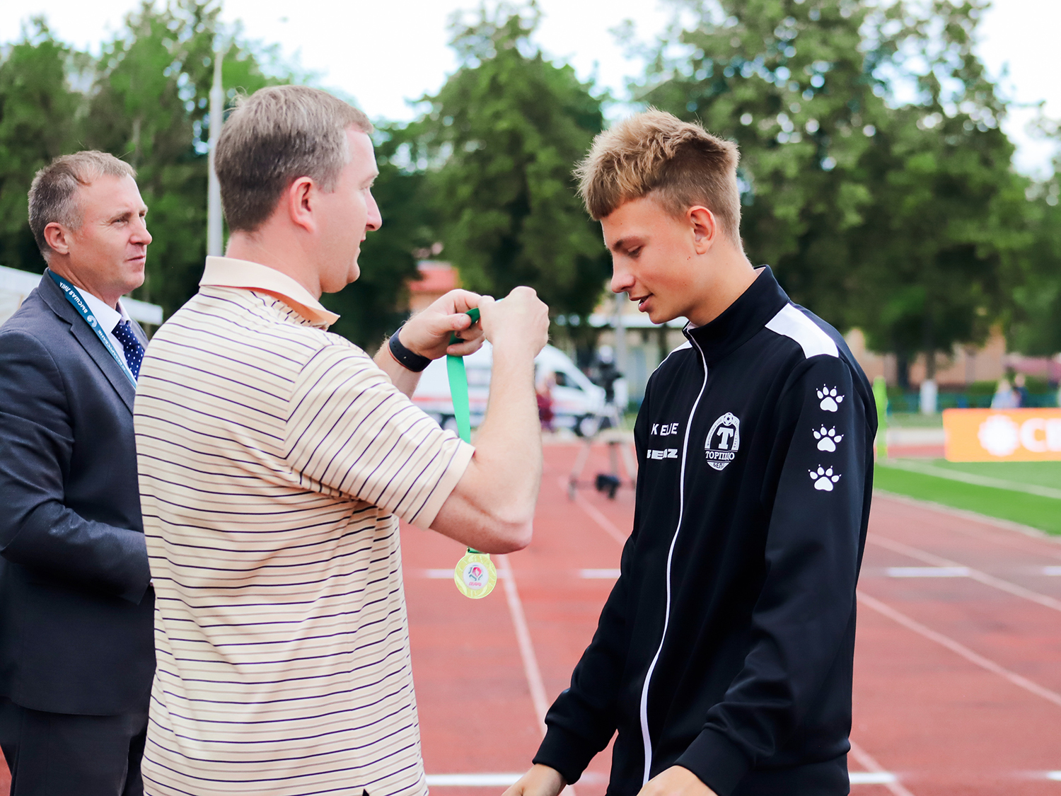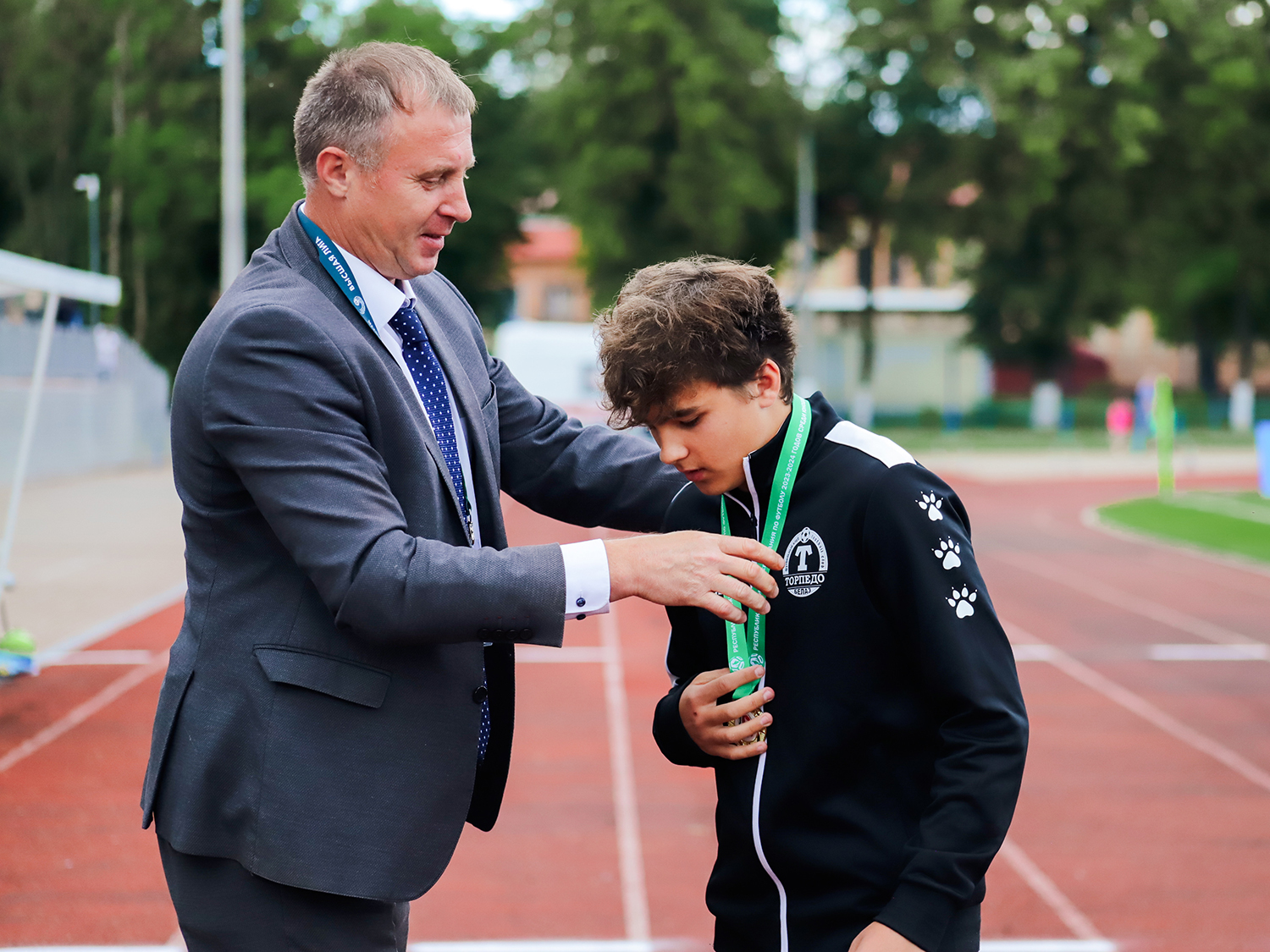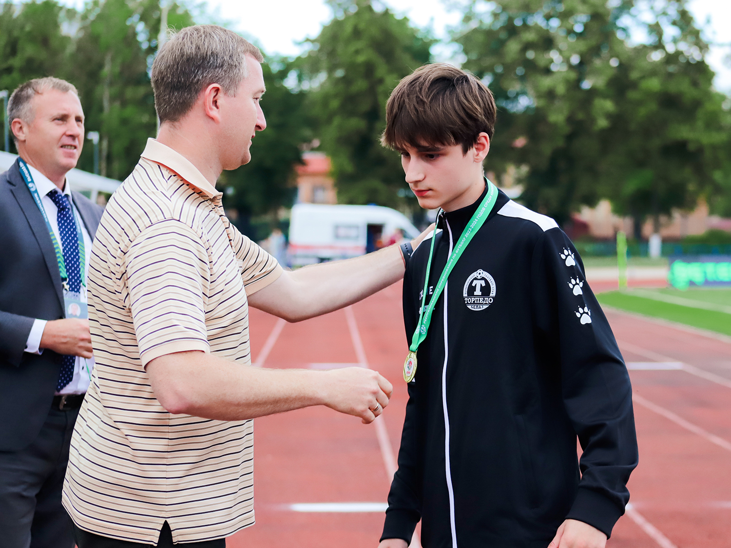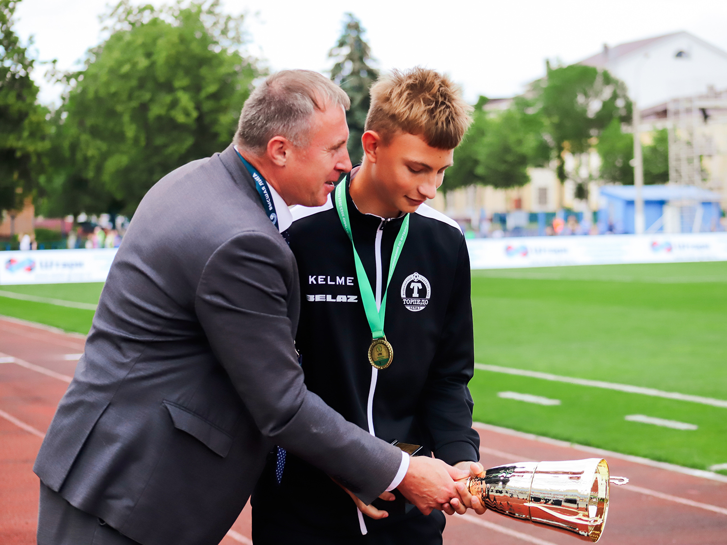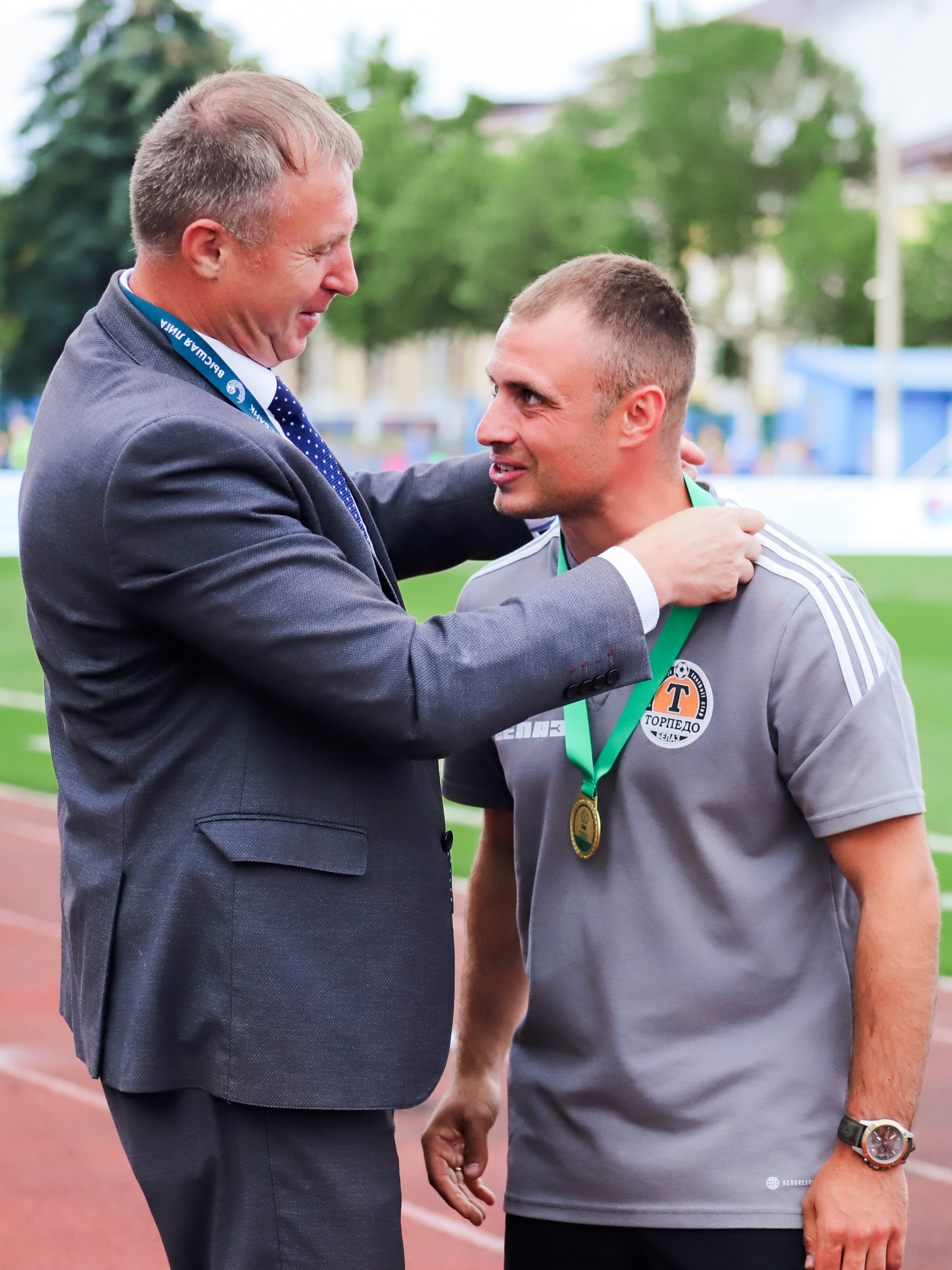 Кубок и золотые медали футболистам и их тренеру Илье Новицкому вручили начальник департамента по проведению соревнований АБФФ Игорь Цаплюк и заместитель директора ФК «ТОРПЕДО-БЕЛАЗ» Алексей Юшкевич.